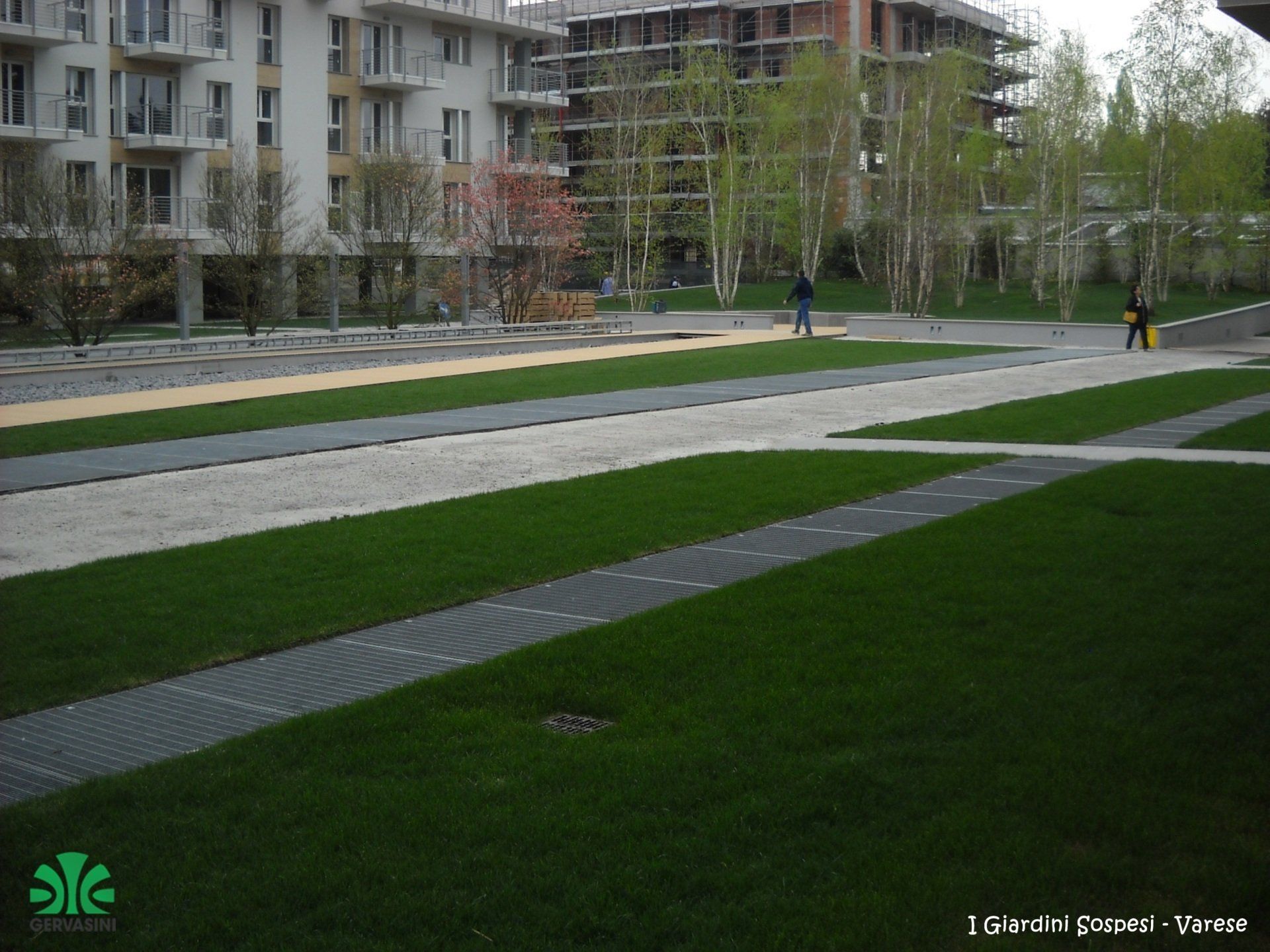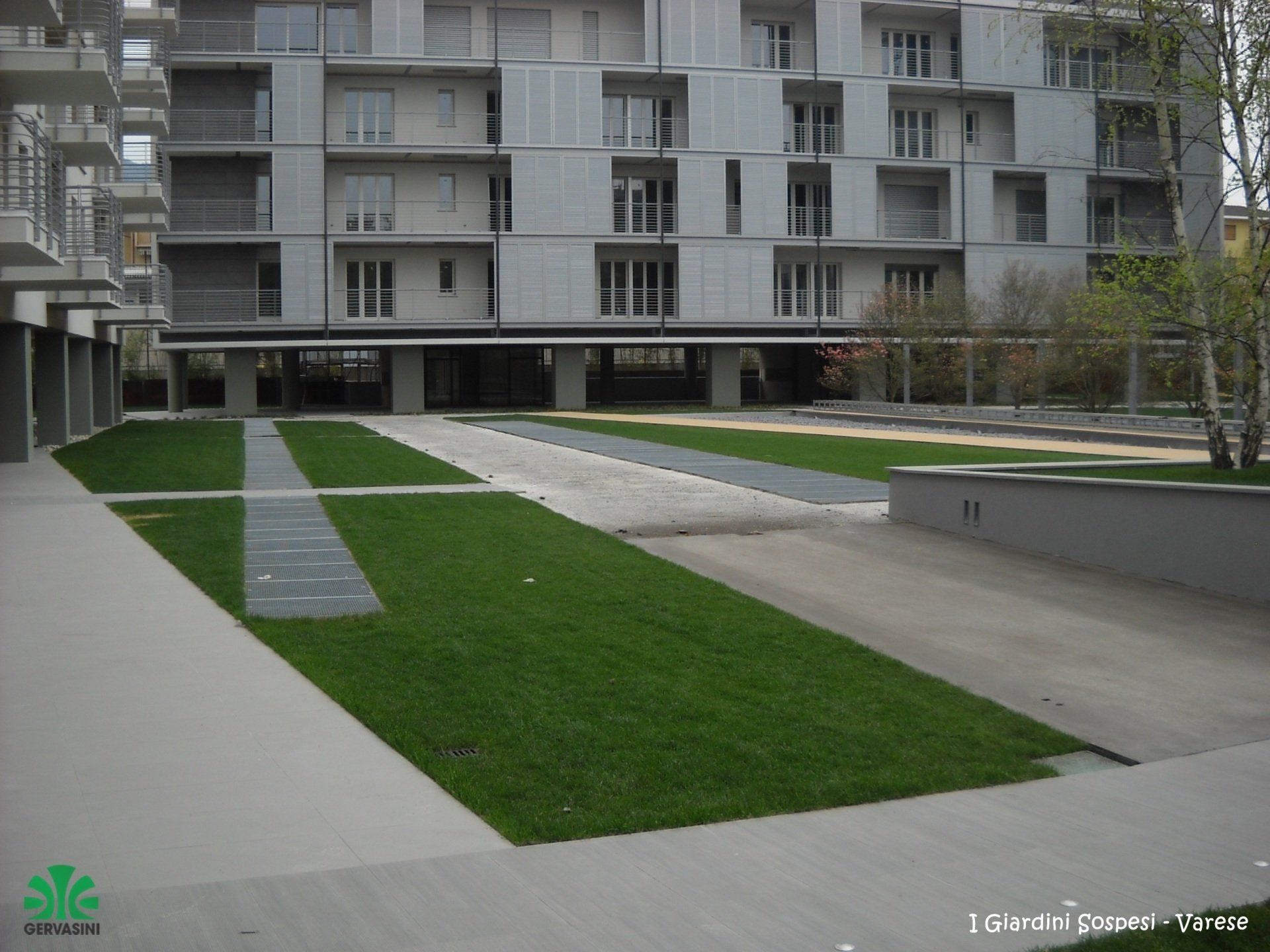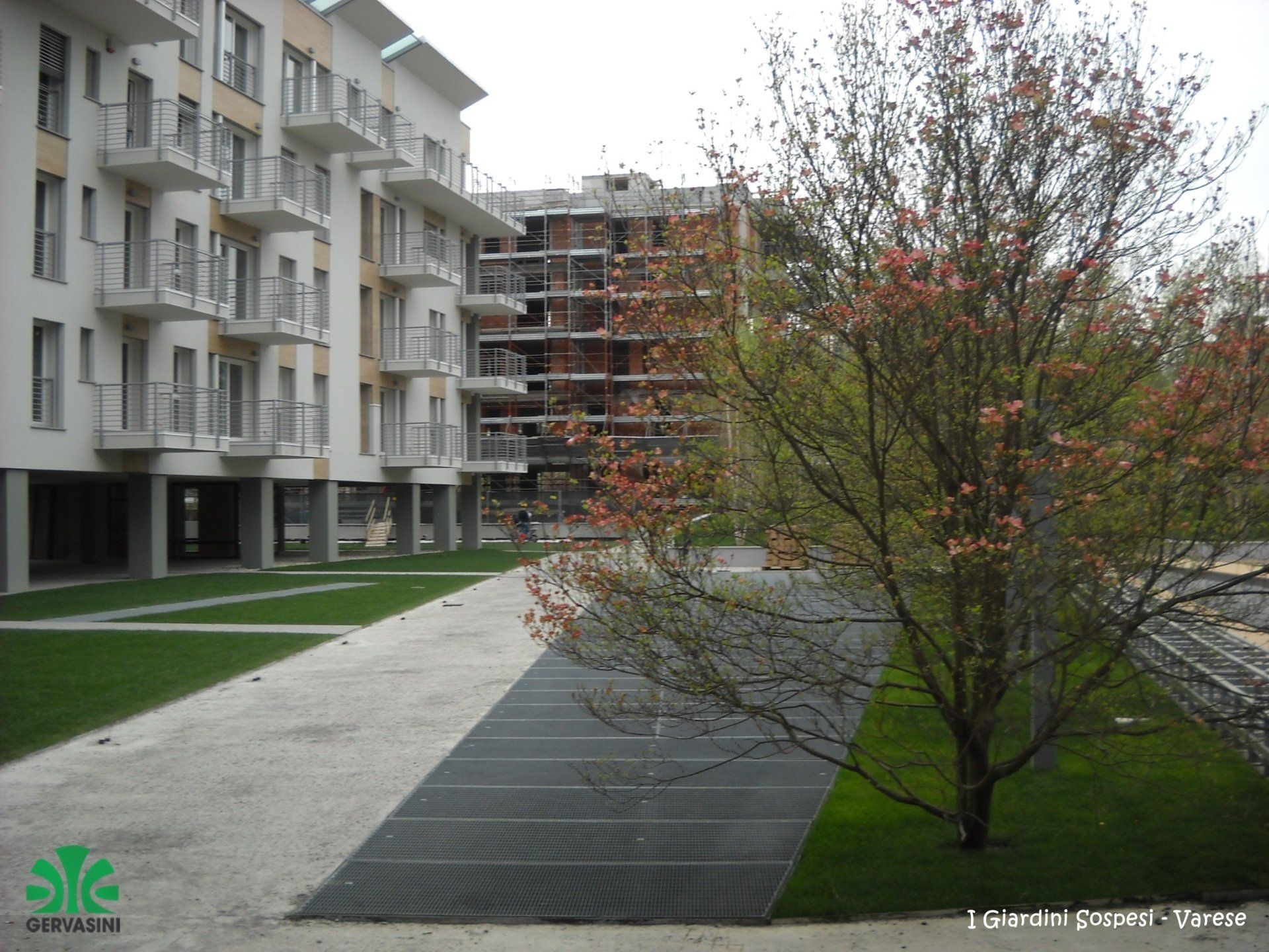 Complesso residenziale "I Giardini Sospesi" - VARESE - Sorto nell'ex sito industriale della SKF, dove il progetto privilegia le superfici a verde rispetto a quelle pavimentate, abbiamo realizzato tutte le opere a verde, l'impianto di subirrigazione ed installato i sistemi di ancoraggio degli alberi.