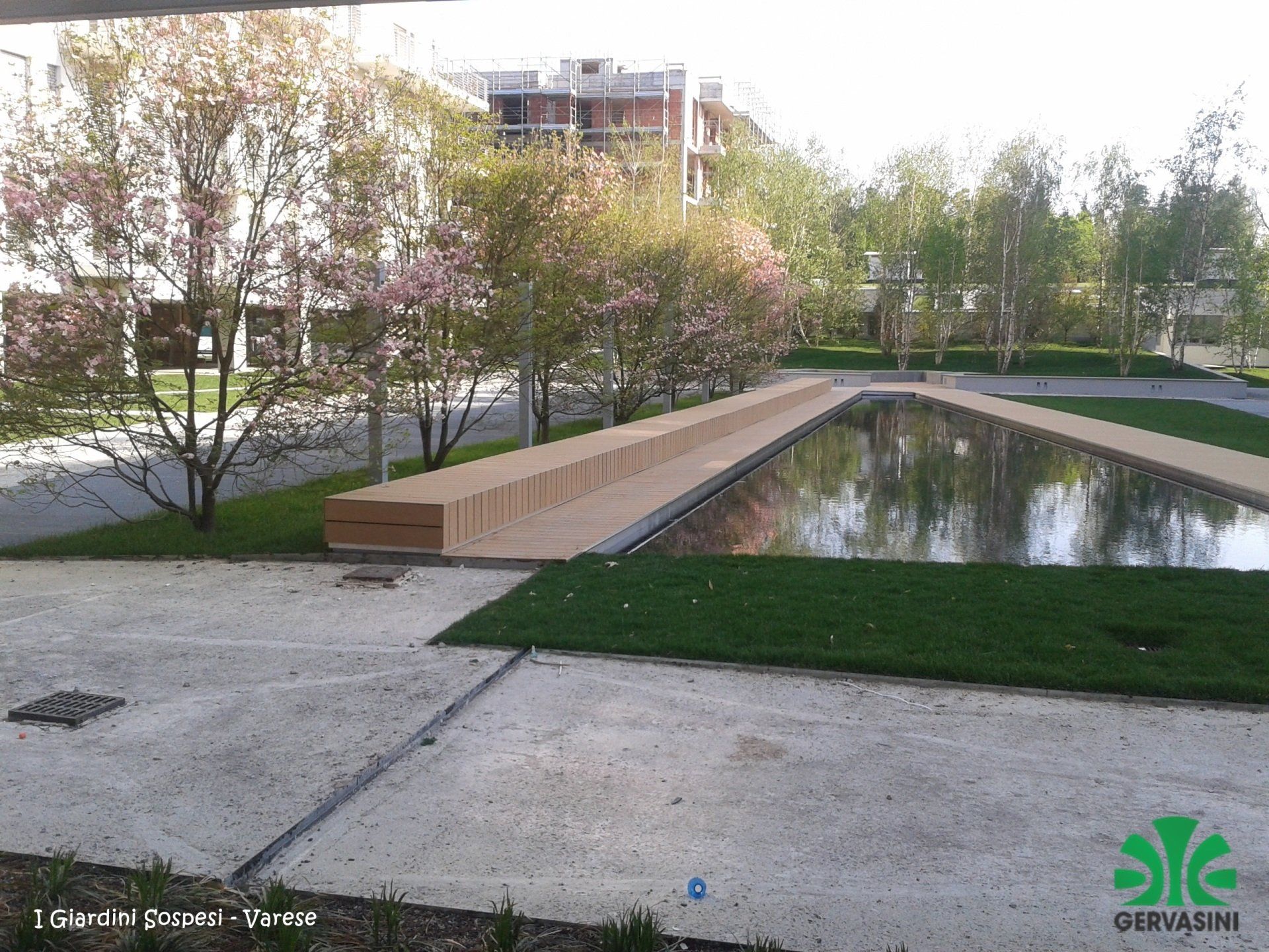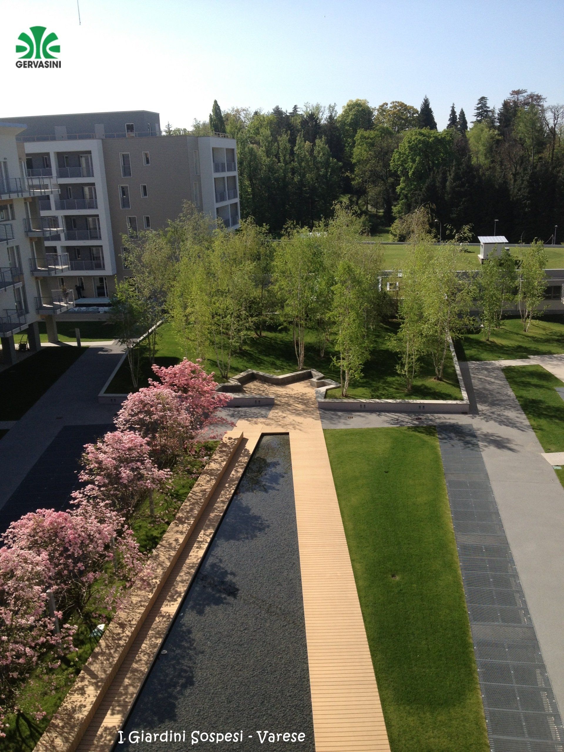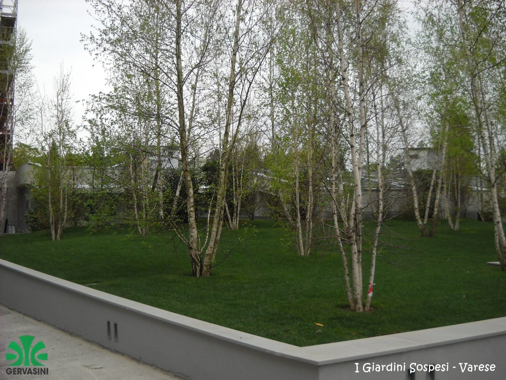 Complesso residenziale "I Giardini Sospesi" - VARESE - Sorto nell'ex sito industriale della SKF, dove il progetto privilegia le superfici a verde rispetto a quelle pavimentate, abbiamo realizzato tutte le opere a verde, l'impianto di subirrigazione ed installato i sistemi di ancoraggio degli alberi.