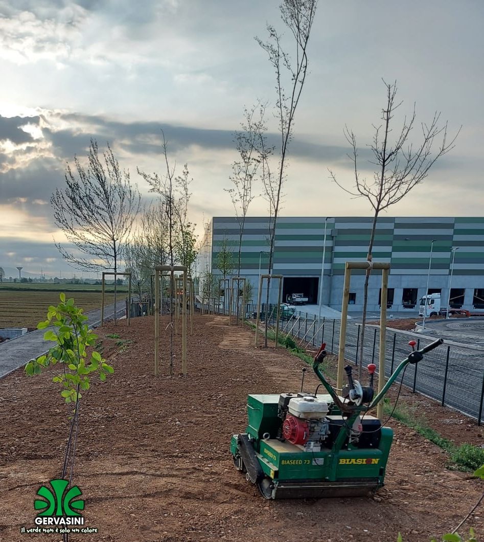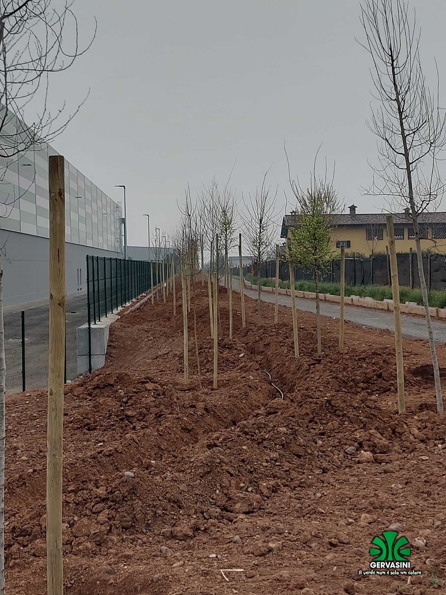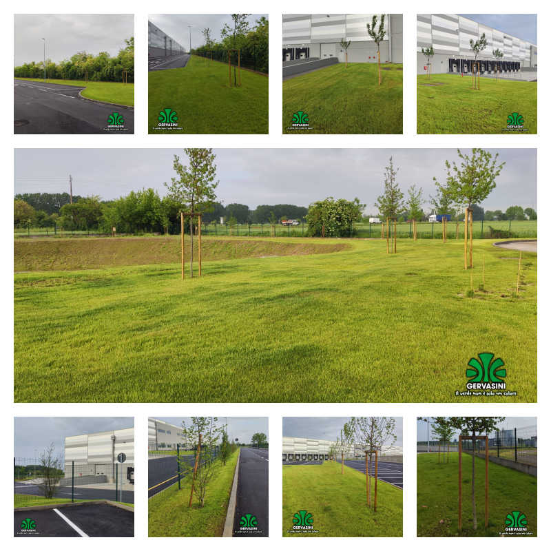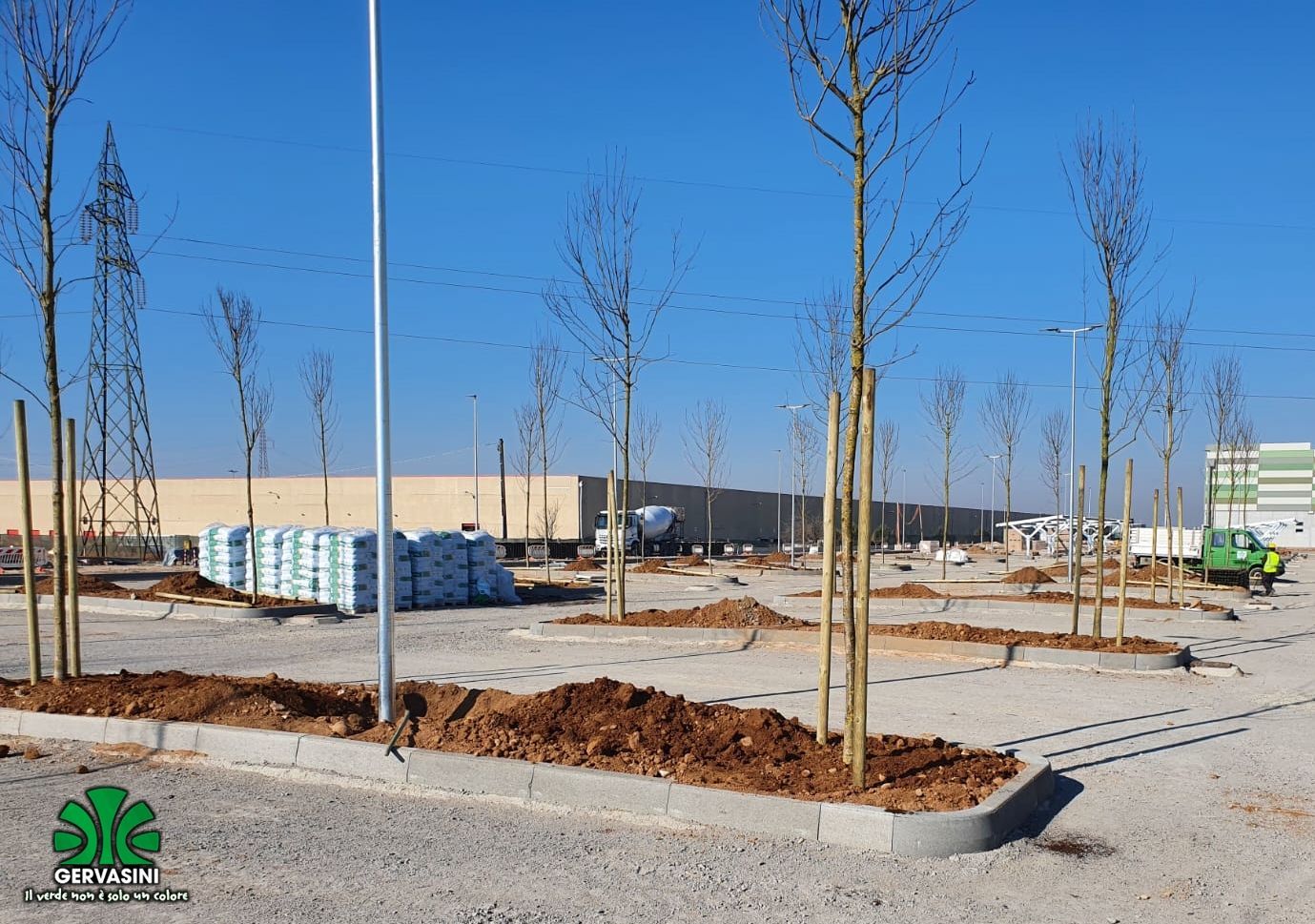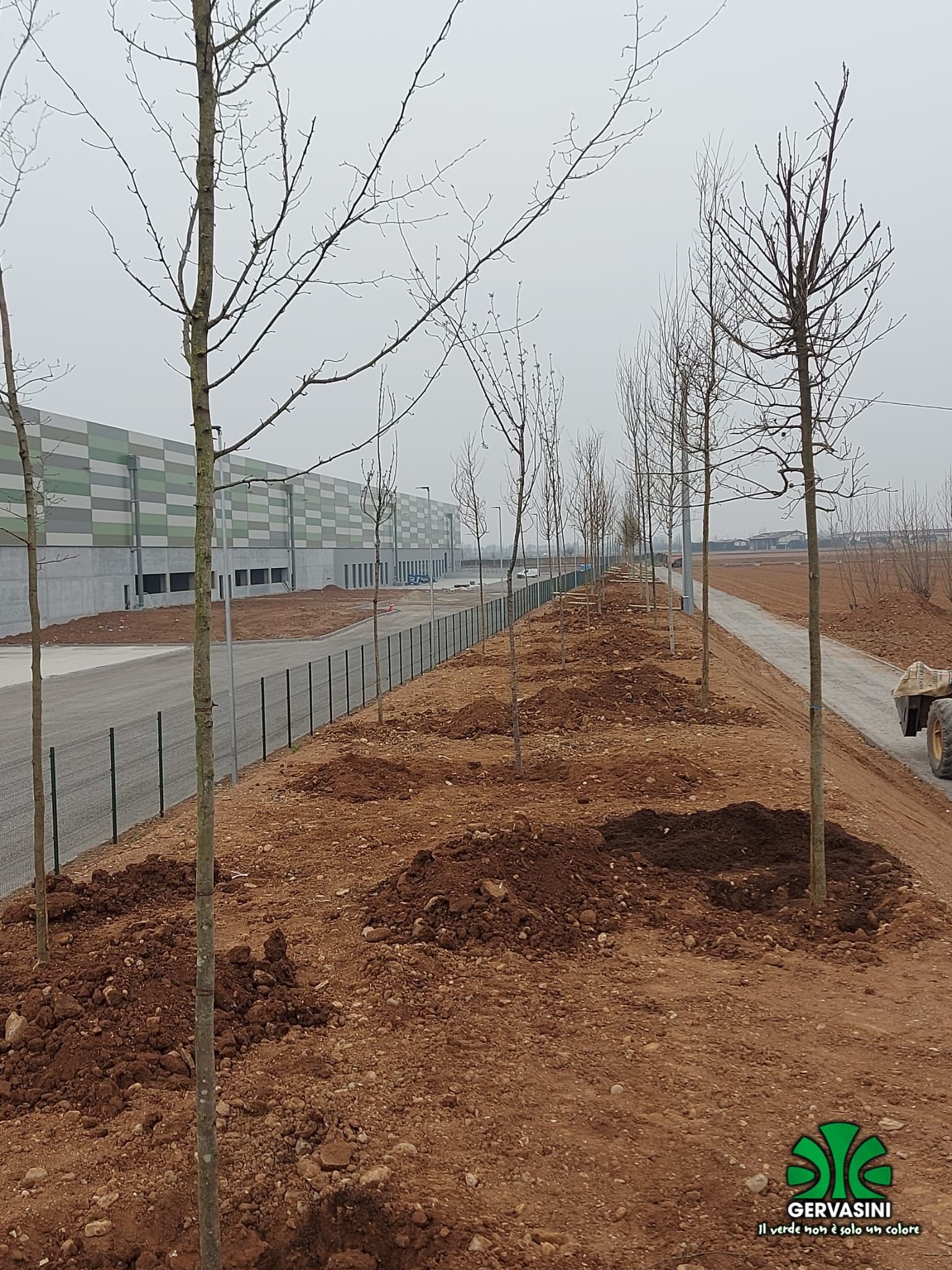 Lavorazioni per realizzazione opere a verde Polo Logistico in Chiari (BS), fornitura e posa nr. 501 alberature crf. da 10-12 a 18-20 cm. e nr. 408 arbusti vaso Ø 18, realizzazione impianto di irrigazione, semina m² 40.000 di tappeto erboso, idrosemina m² 10.000.