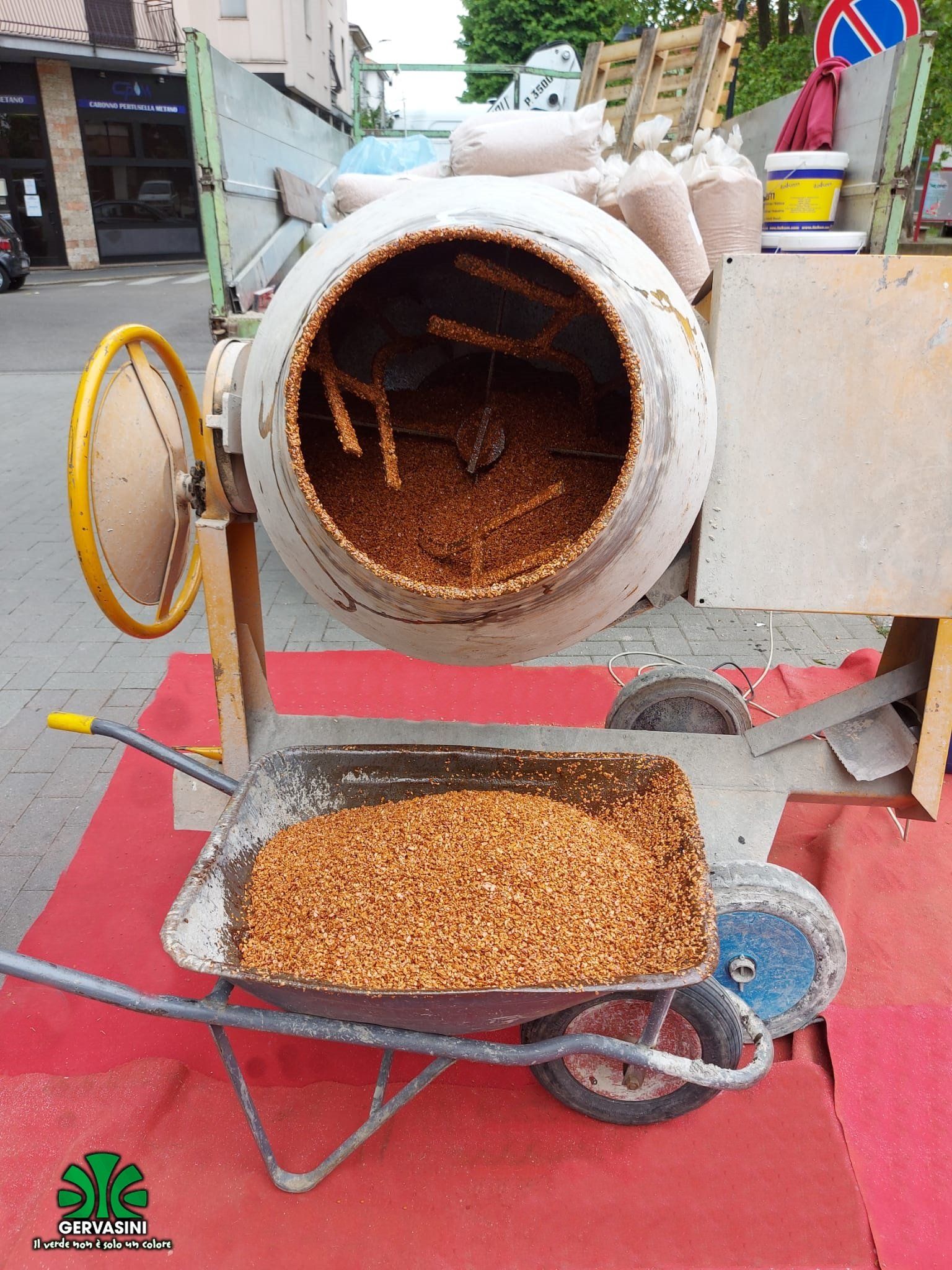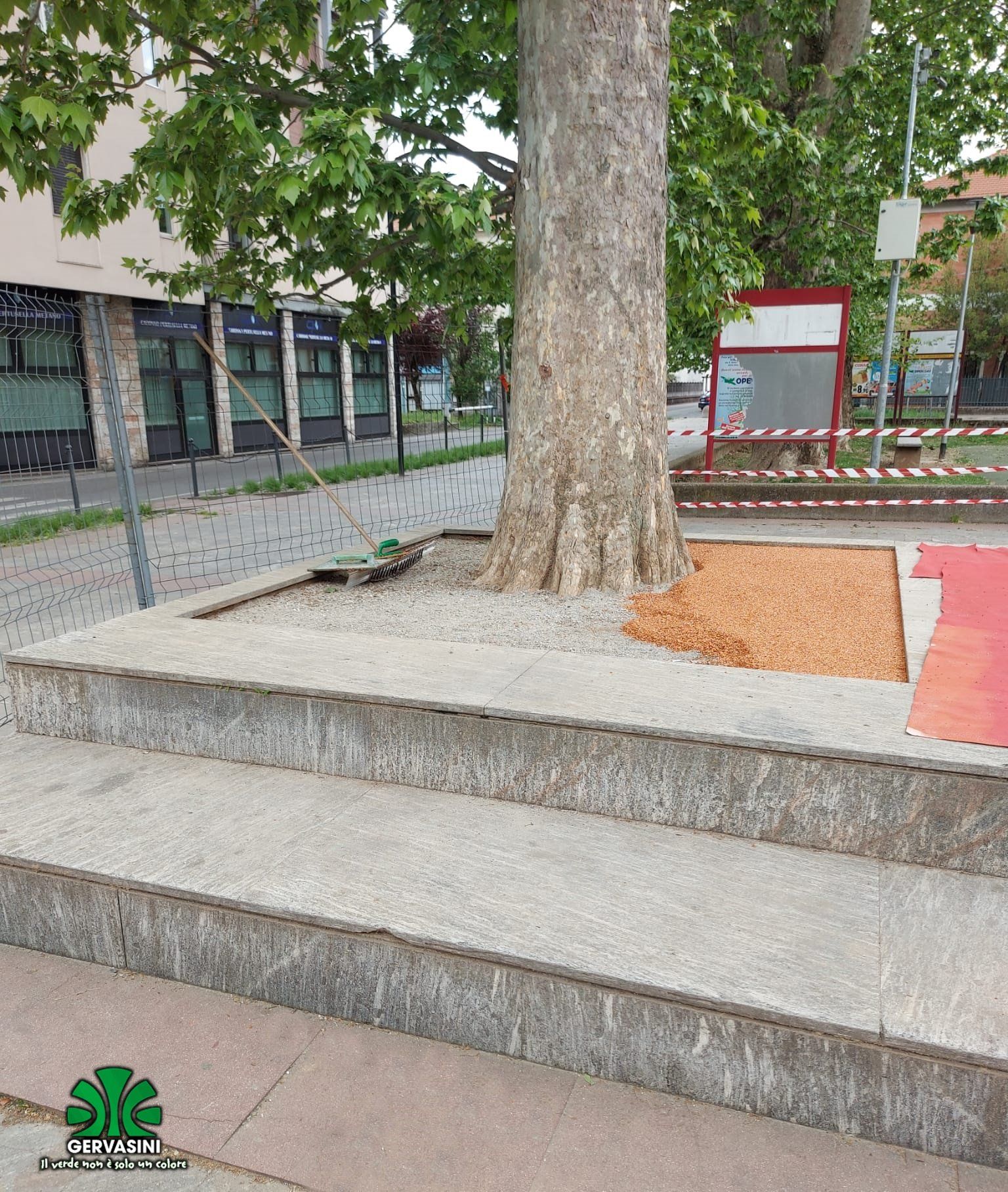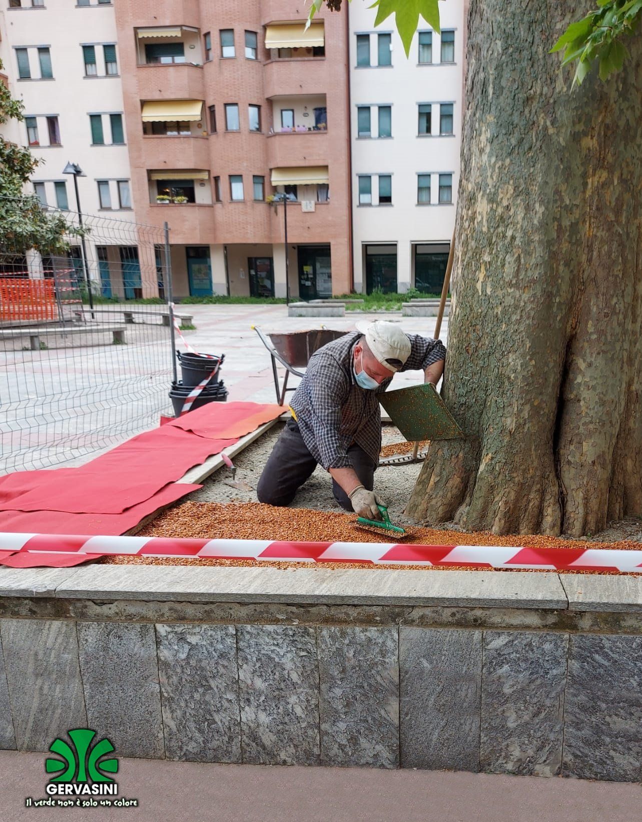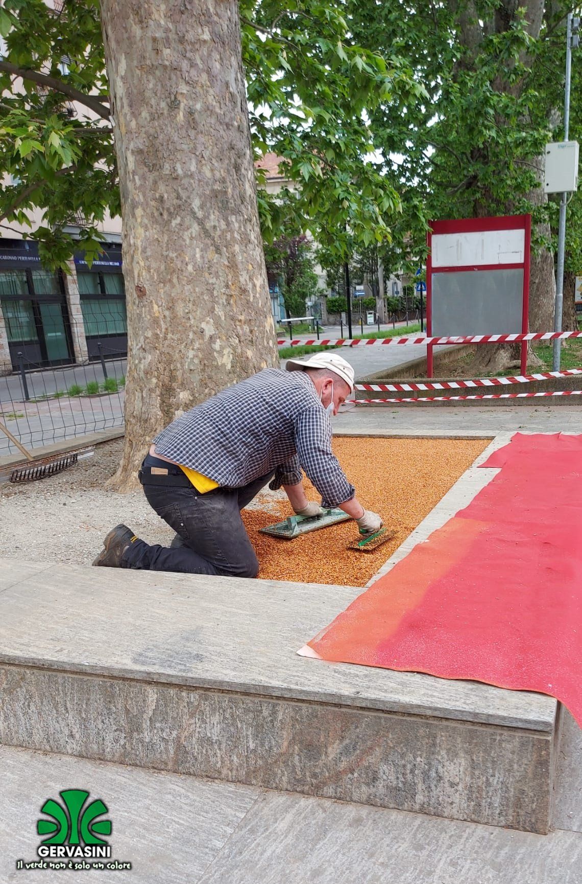 Arredo urbano con posa del prodotto RASOCRETE® PLUS colore ROSSO VERONA prodotto da ITALKEM Srl, usato in questo caso a contorno degli alberi.